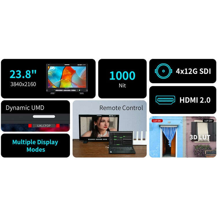 El FeelWorld S24 es un monitor de vídeo IPS de 23,8" con resolución 4K/8K y alto brillo, diseñado para la producción y posproducción profesionales. Gracias a sus cuatro entradas/salidas 12G-SDI, HDMI I/O, un brillo de 1000 nits, el sistema de exposición EL Zone, la compatibilidad con 3D LUT y la función multivista multicámara, es ideal para retransmisiones en directo, monitorización en plató y flujos de trabajo en los que es importante una reproducción precisa del color.