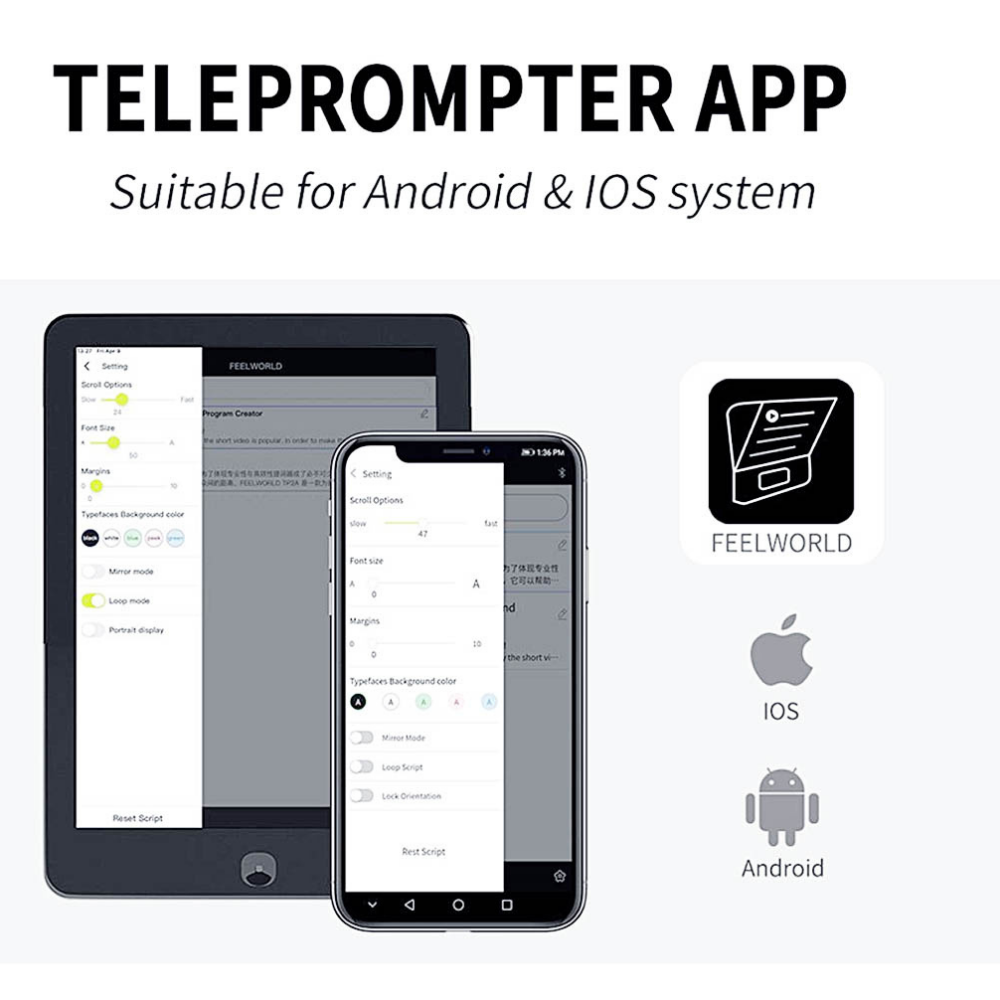 El dispositivo de lectura universal Feelworld TP13 permite visualizar texto en prácticamente cualquier teléfono o tableta (hasta 11 pulgadas) y grabar vídeo tanto con teléfonos como con cámaras DSLR/DSLM gracias al ingenioso diseño de sus pinzas y al soporte de cámara regulable en altura (rango de hasta 6 cm). También incluye un parasol de tela extraíble, anillos de espuma y un mando a distancia Bluetooth que se comunica con la aplicación para Android/iOS incluida.