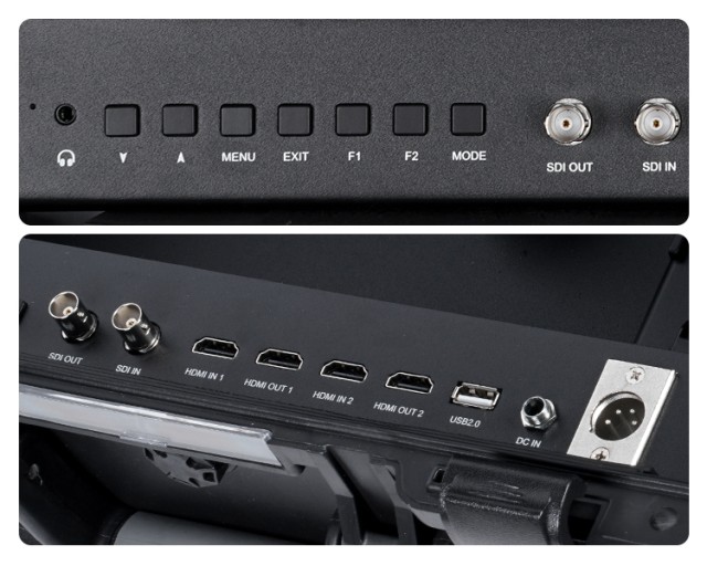 El monitor está diseñado para un montaje flexible, con varias roscas de 1/4"-20 para accesorios, como transmisores de vídeo inalámbricos, y un soporte metálico integrado para su uso con trípode. La salida estéreo para auriculares permite monitorizar el sonido directamente en el plató.