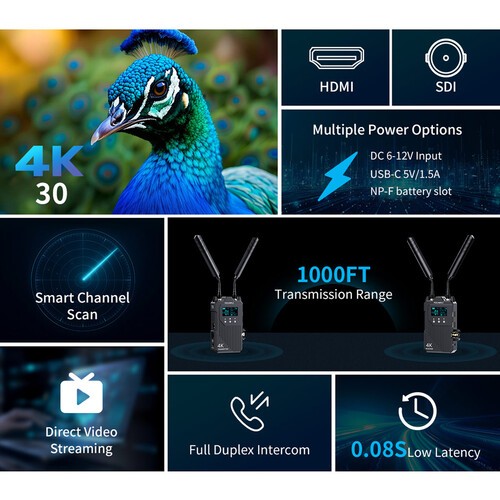 El Feelworld WT1S es un sistema inalámbrico profesional para la transmisión de vídeo SDI/HDMI con un alcance de hasta 300 metros, una latencia ultrabaja de 0,08 segundos y comunicación por intercomunicador totalmente dúplex. Admite vídeo UHD 4K30 / 1080p60, conecta hasta cuatro receptores y permite la monitorización y la grabación mediante una aplicación para iOS/Android, lo quelo hace ideal para la producción cinematográfica, la producción en directo y la retransmisión.