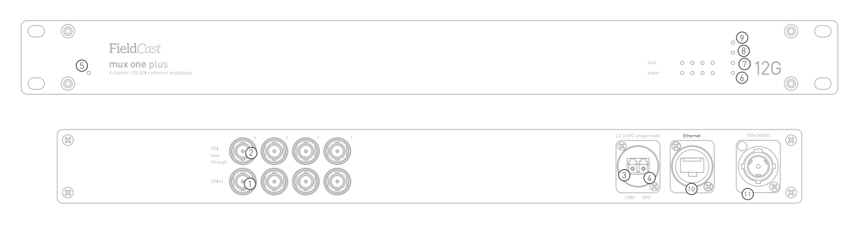 - Un canal óptico LC monomodo (U)PC (COM) para todas las señales SDI y Ethernet