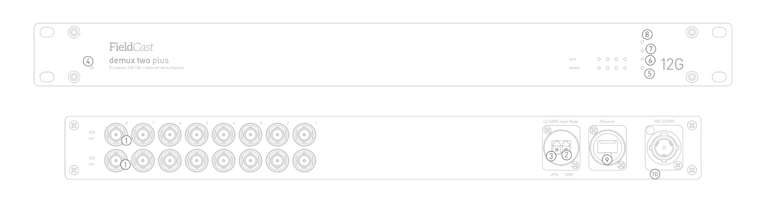 - Demultiplexor: 1 entrada óptica → 8 canales de salida SDI, más un extensor óptico Ethernet de 1 Gb