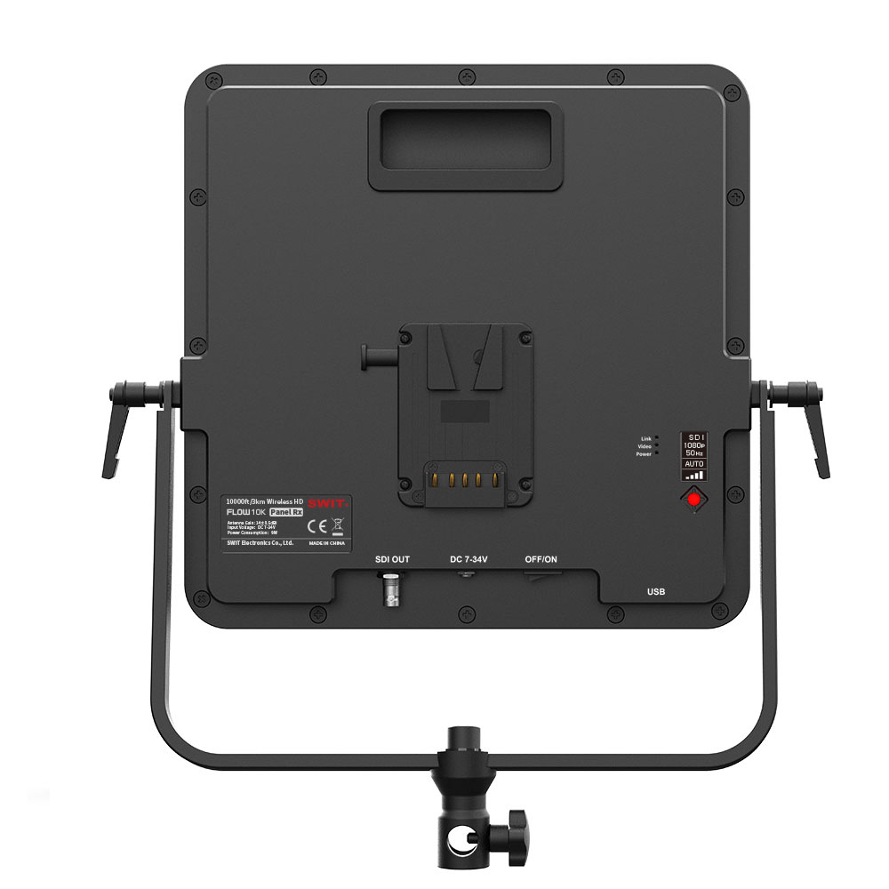 El receptor de panel está equipado con una placa de batería V-mount y una toma de 7-34 V DC-IN.