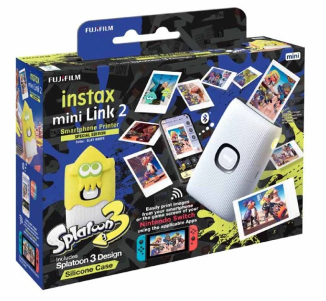 La Fujifilm Instax Mini Link 2 NS Splatoon 3 Special Edition es una impresora portátil para smartphones diseñada para jugadores y creadores. Gracias a su diseño único inspirado en el juego Splatoon 3 y a su funda de silicona, permite imprimir al instante fotos y capturas de pantalla de Nintendo Switch™ y añadir efectos creativos, pegatinas y dibujos en realidad aumentada a través de la aplicación Instax Mini Link.