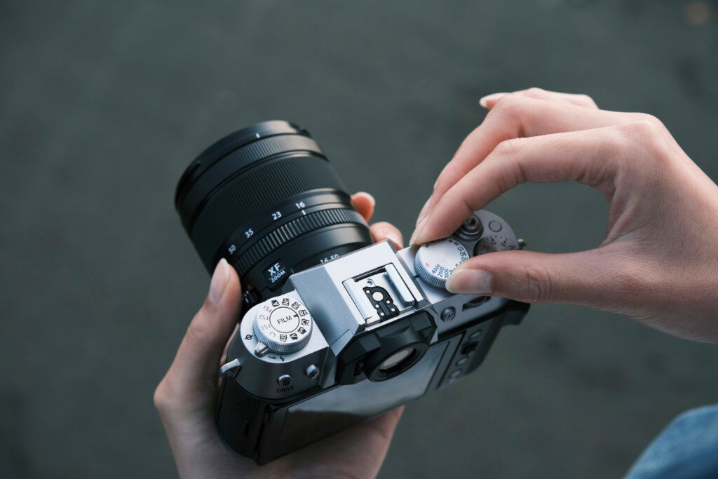 En la parte superior de la cámara FUJIFILM X-T50 se encuentran los controles de velocidad de obturación, compensación de exposición y los nuevos controles de simulación de película. Junto con el anillo de apertura de la mayoría de los objetivos XF, los ajustes se pueden controlar y modificar incluso sin encender la cámara, para que puedas concentrarte en lo más importante: crear la foto perfecta.