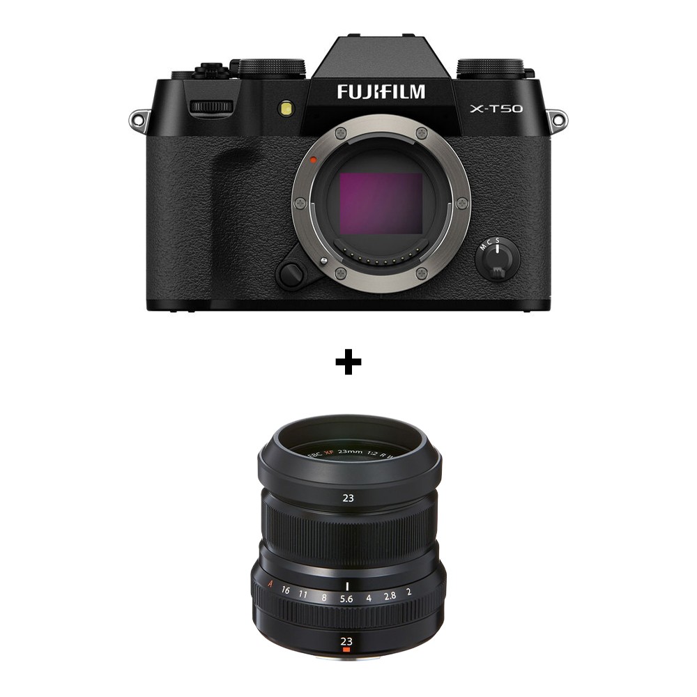 La Fujifilm X-T50 Black es una ligera cámara sin espejo APS-C inspirada en las cámaras de telémetro (123,8 × 84 × 48,8 mm, 438 g con batería/tarjeta SD) equipada con un sensor X-Trans CMOS 5 HR de 23,5 × 15,6 mm con una resolución de 40,2 MP y un procesador X-Processor 5, que permite capturar imágenes RAW de 14 bits con una resolución de 7728 × 5152, ISO nativo de 125-12 800 (ext. 64-51 200) y un obturador electrónico ultrarrápido con una velocidad de hasta 1/180 000 s para un control preciso de la exposición. Entre las funciones de vídeo se incluyen 6,2K/30p open-gate 3:2 (200 Mb/s, H.265 de 10 bits), 4K/60p y FHD/240p en cámara lenta con lectura completa del sensor, con soporte de IS digital + IS Boost para la estabilidad en el manejo manual. El sistema híbrido de enfoque automático con detección de fase y contraste de 425 puntos funciona hasta -7 EV con reconocimiento de objetos mediante IA de aprendizaje profundo (personas, animales, aves, vehículos, aviones, insectos, drones) y seguimiento. El selector giratorio especial de simulación de película situado en la parte superior ofrece acceso inmediato a 20 modos, incluidos REALA ACE y Nostalgic Neg., con tres ranuras personalizables; el modo AUTO selecciona automáticamente los ajustes mediante el reconocimiento de objetos. El IBIS de 5 ejes ofrece una compensación de hasta 7 grados (CIPA, inclinación/giro con el XF35mm f/1,4), mientras que el EVF OLED de 0,39" y 2,36 millones de puntos (ampliación de 0,62×, 100 fps) y la pantalla táctil orientable de 3" y 1,84 millones de puntos (AF táctil/control táctil) facilitan los ángulos creativos. Las conexiones incluyen USB-C de 10 Gbps (carga/datos), micro-HDMI (salida RAW de 12 bits), Wi-Fi 4, Bluetooth 5.2 y conector de 2,5 mm para micrófono/control remoto; el almacenamiento lo proporcionan dos ranuras UHS-II SD. El flash integrado (GN 5) y la zapata TTL admiten iluminación externa. La batería NP-W126S proporciona ~305 disparos (CIPA LCD). En combinación con el objetivo XF 23 mm f/2,0 R WR, forma un kit versátil para la fotografía callejera con una óptica resistente y rápida.
