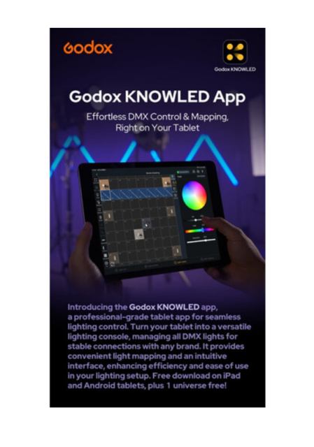 | Control de la iluminación | Control integrado, DMX-512 / RDM, CRMX (LumenRadio), Bluetooth (aplicación Godox Light), Art-Net y sACN |