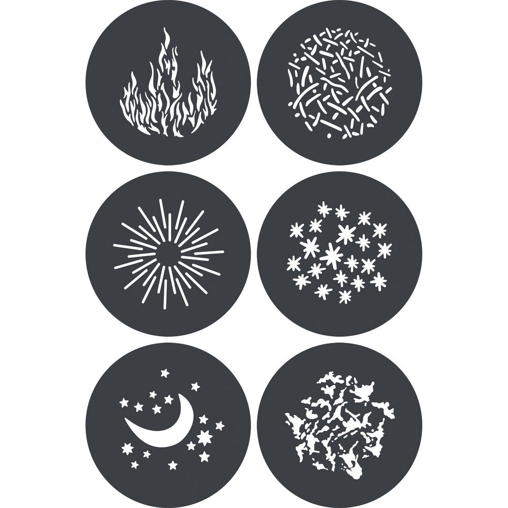 El kit Godox Knowled GP-GS1 GOBO incluye seis gobos de acero de 148 mm diseñados para el soporte de reflector MG1200Bi, que permiten la proyección creativa de motivos como fuego, estrellas, la luna y texturas difuminadas, ideales para aplicaciones teatrales, cinematográficas, de vídeo y de moda.
