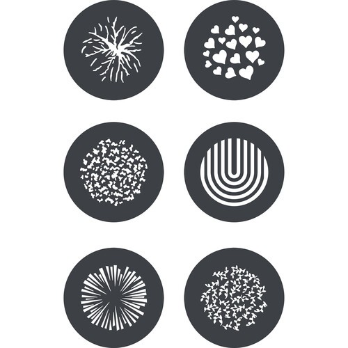Mejora tu proyector Godox MG1200Bi con el kit GP-GS2 Gobo Set, que incluye seis gobos de acero que proyectan motivos creativos, como fuegos artificiales, rayos de sol, corazones y mucho más, ideales para teatro, cine, moda y efectos escénicos.