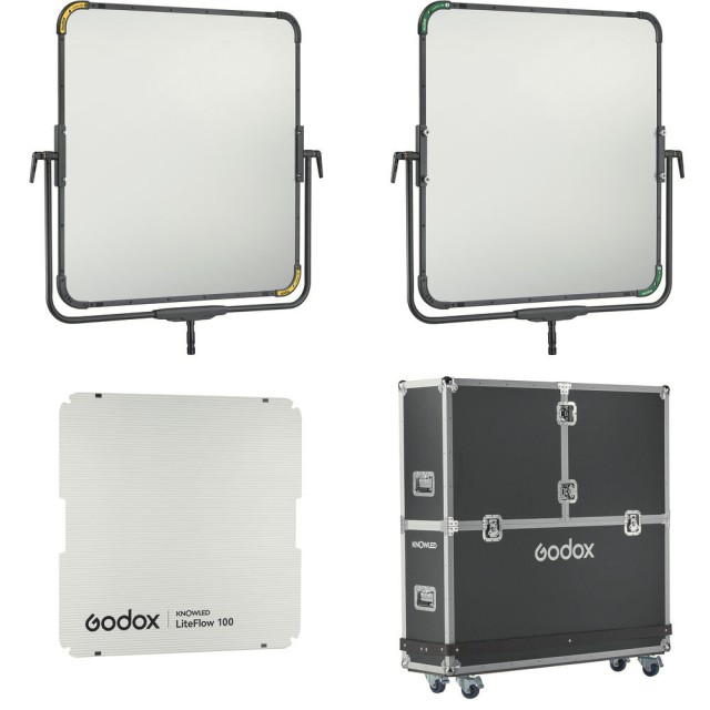 El kit Godox Knowled LiteFlow 100 K1 ofrece una solución versátil y profesional para el control de la luz en montajes cinematográficos y fotográficos. Este kit incluye dos reflectores de doble cara de 40 × 40 pulgadas, cada uno montado en un marco resistente, lo que permite un montaje rápido y una configuración flexible de la luz.