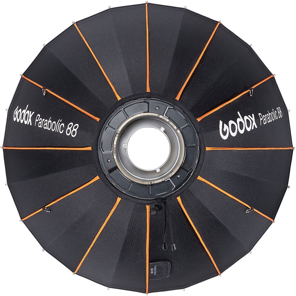 El reflector Godox Parabolic 88 tiene un diámetro de 35,4 pulgadas, un diseño parabólico profundo y un interior plateado altamente reflectante que proporciona tonos claros y nítidos y una luz con un bonito contorno, ideal para la fotografía de retratos y de moda.