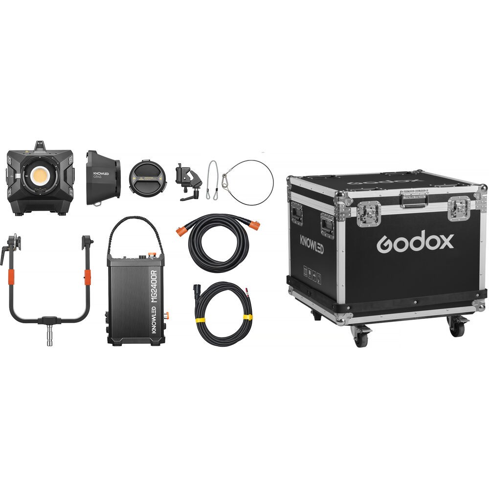 El Godox KNOWLED MG2400R RGB LED Monolight con maleta de transporte es una solución de iluminación profesional diseñada para producciones de estudio, cine y televisión. Este monolight alimentado por red ofrece un espectro completo de 1800–10 000 K CCT, control de color RGB, 14 modos FX y funcionamiento sin parpadeos, y proporciona una iluminación precisa y versátil. El MG2400R se suministra con una maleta resistente, un reflector, una fuente de alimentación y un soporte, y está preparado para exigentes rodajes tanto en interiores como en exteriores.