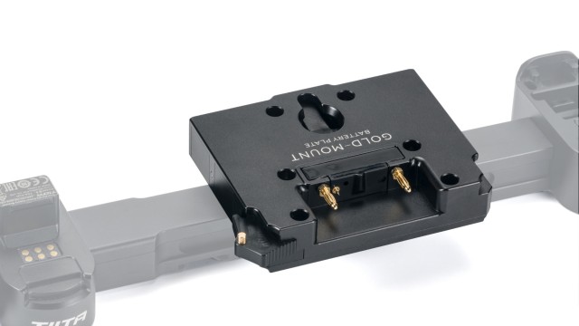 Esta placa para el soporte dorado de las baterías se conecta directamente al soporte de alimentación con doble asa para el RS2 y permite alimentar el gimbal mediante baterías doradas de mayor capacidad sin necesidad de cables externos.