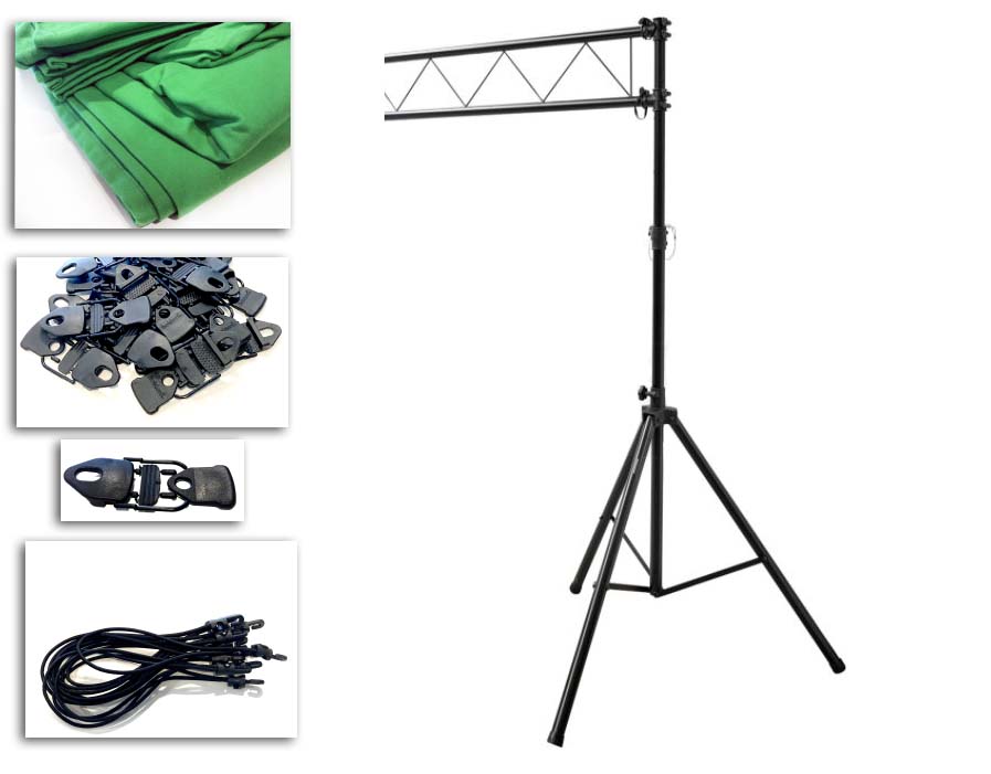 Fondo verde de 3 x 3 m, incluyendo trípodes y estructura de unión para colgar la tela. Solución completa para la instalación llave en mano.