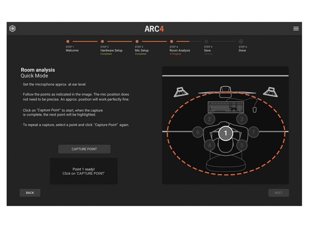 • Conecta el micrófono de medición a la interfaz y se te guiará a través de la medición de los puntos acústicos de la sala de escucha. ARC creará un perfil acústico en 3D de tu sala de escucha. A partir de ahí, identificará los problemas y llevará a cabo una corrección completa de todos los puntos problemáticos que deterioran el rendimiento de tus monitores.