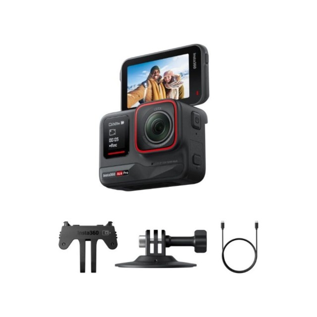 Además de la propia cámara Insta360 Ace Pro, también recibirás una batería con una capacidad de 1650 mAh, un soporte estándar, una sujeción adhesiva flexible y un cable USB-C para la conexión.