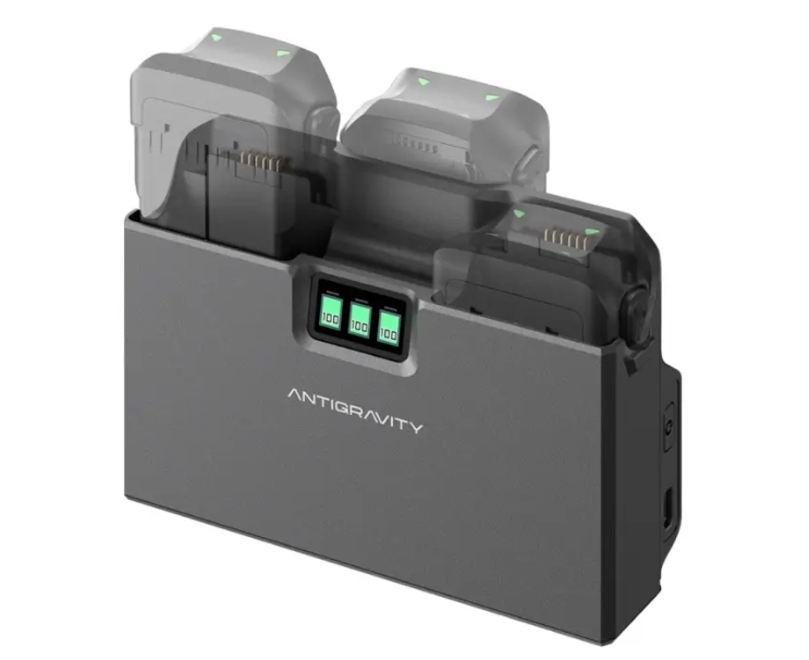 El cargador Insta360 INST920-05 es una solución compacta e inteligente para cargar las baterías de los drones Antigravity A1. Carga hasta tres baterías de forma secuencial, es compatible con la carga rápida USB-C PD/PPS y también funciona como batería externa para dispositivos USB-C.