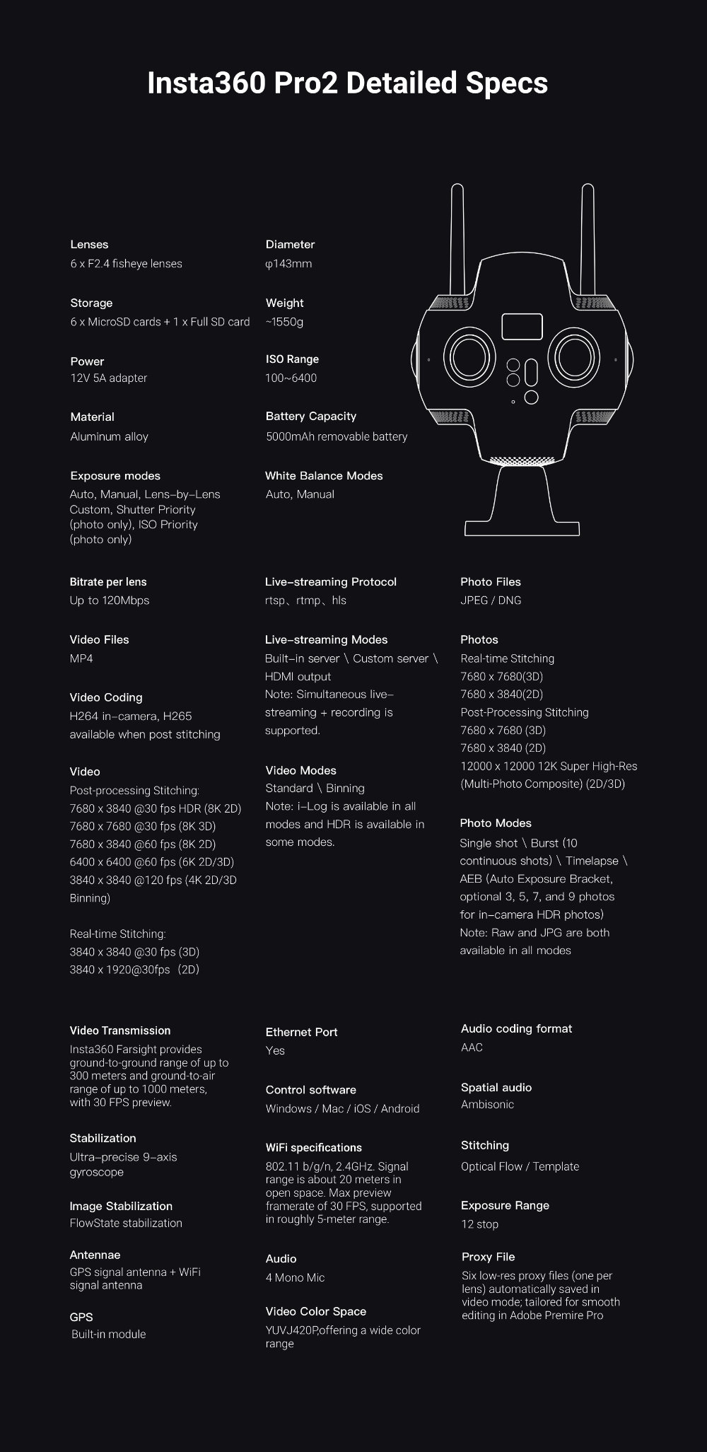 La Insta360 Pro 2 es una cámara profesional de 360 grados diseñada para capturar contenido de realidad virtual (VR) y vídeo inmersivo de alta calidad. Está equipada con seis lentes capaces de capturar vídeo con una resolución de hasta 8K y fotografías con una resolución de 12K, así como con tecnología avanzada de estabilización y corrección de color. Gracias a su amplia gama de modos de captura y a sus funciones avanzadas de posproducción, la cámara Insta360 Pro 2 es una potente herramienta para los creadores de contenido de RV y los profesionales de diversos sectores.