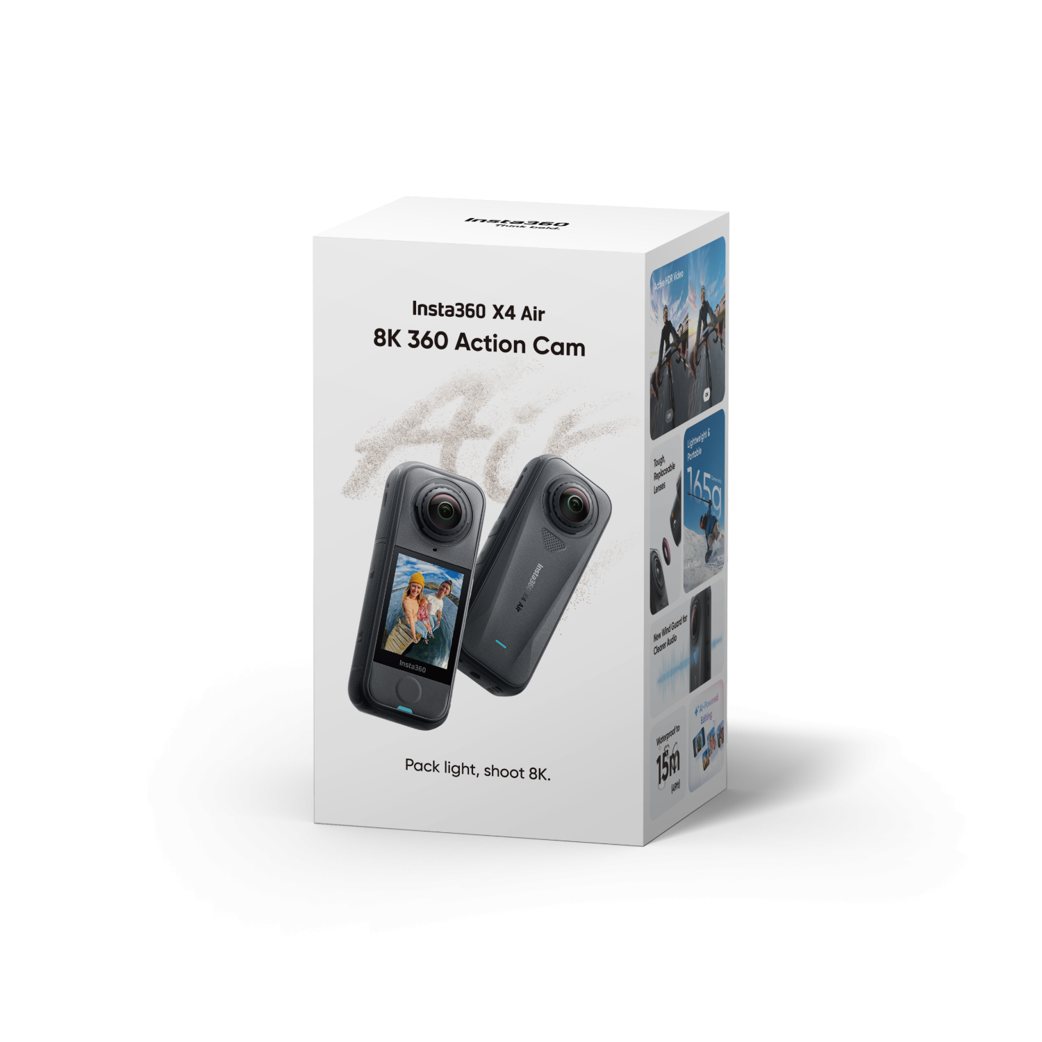 El Insta360 X4 Air Standard Bundle es una cámara para exteriores que permite grabar en resolución 8K (7680 × 3840) a 30 fotogramas por segundo. El sensor es de tipo CMOS y tiene una apertura de f/1,95. La cámara ofrece grabación en 360°, es compatible con tarjetas microSDHC y está equipada con un giroscopio de seis ejes.
