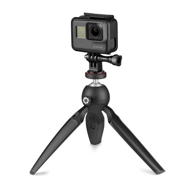 Te ayuda a capturar tomas difíciles sin fallos. Úsalo con las patas cerradas como empuñadura para grabar vídeos de aspecto profesional. El mecanismo de botón permite ajustar y bloquear la rótula con un solo movimiento rápido y colocarla en posición vertical para tomas verticales.