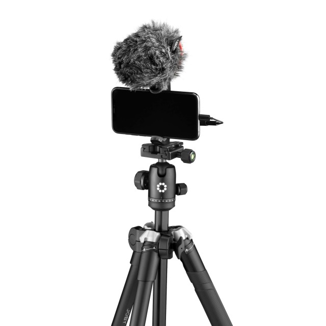 Disponible en aluminio rojo y negro. También se suministra con un soporte para teléfono Joby con un mecanismo de doble bloqueo seguro, que cuenta con dos roscas de 1/4" para fijar el teléfono tanto en horizontal como en vertical. Es compatible con todos los smartphones de 60 a 140 mm de ancho.