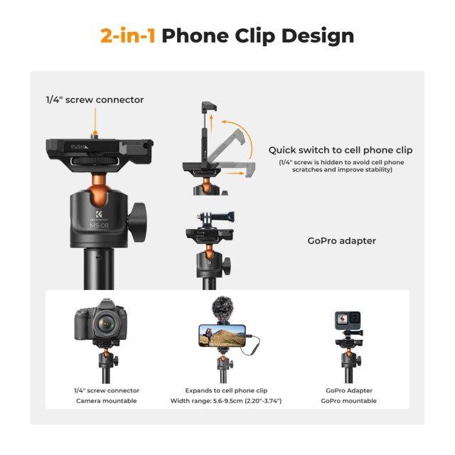 • Compatibilidad versátil: gracias a su interfaz de 1/4 de pulgada, es adecuado para una amplia gama de dispositivos con un peso de hasta 3 kg, incluyendo cámaras sin espejo, smartphones y otros.