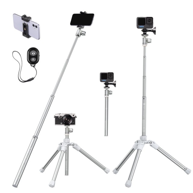 Trípode versátil. Puedes alternar entre trípode, soporte de mesa y palo selfie. Esto resulta muy práctico y se adapta a las necesidades de muchos escenarios fotográficos diferentes, como viajes, grabación de vlogs, retransmisiones en directo, etc.