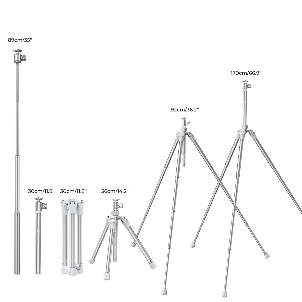 - * 【Súper portátil para viajar】El tubo de 4 secciones permite ajustar la altura de trabajo del trípode de 36 cm/14,1'' a 170 cm/66,9'' en cuestión de segundos; una vez plegado, mide solo 30 cm/11,8'' y pesa tan solo 0,88 kg/1,94 kg, por lo que es ideal para fotografiar en interiores o exteriores durante tus viajes.