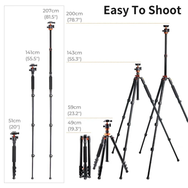 Cabezal esférico de 28 mm con giro de 360° y visión panorámica. El modelo K234A7, con dos mandos de control independientes, cuenta con un cabezal esférico especialmente diseñado que puede girar 360 grados, lo que te permite tomar fotografías desde cualquier ángulo, tanto en horizontal como en vertical. Las patas de 4 secciones con 3 cierres de bloqueo rápido permiten ajustar la altura de trabajo de 23 a 78 pulgadas en cuestión de segundos. ¡El ganador en la categoría de altura! Su tamaño plegado de 18 pulgadas facilita su transporte a cualquier lugar para fotografiar en exteriores.