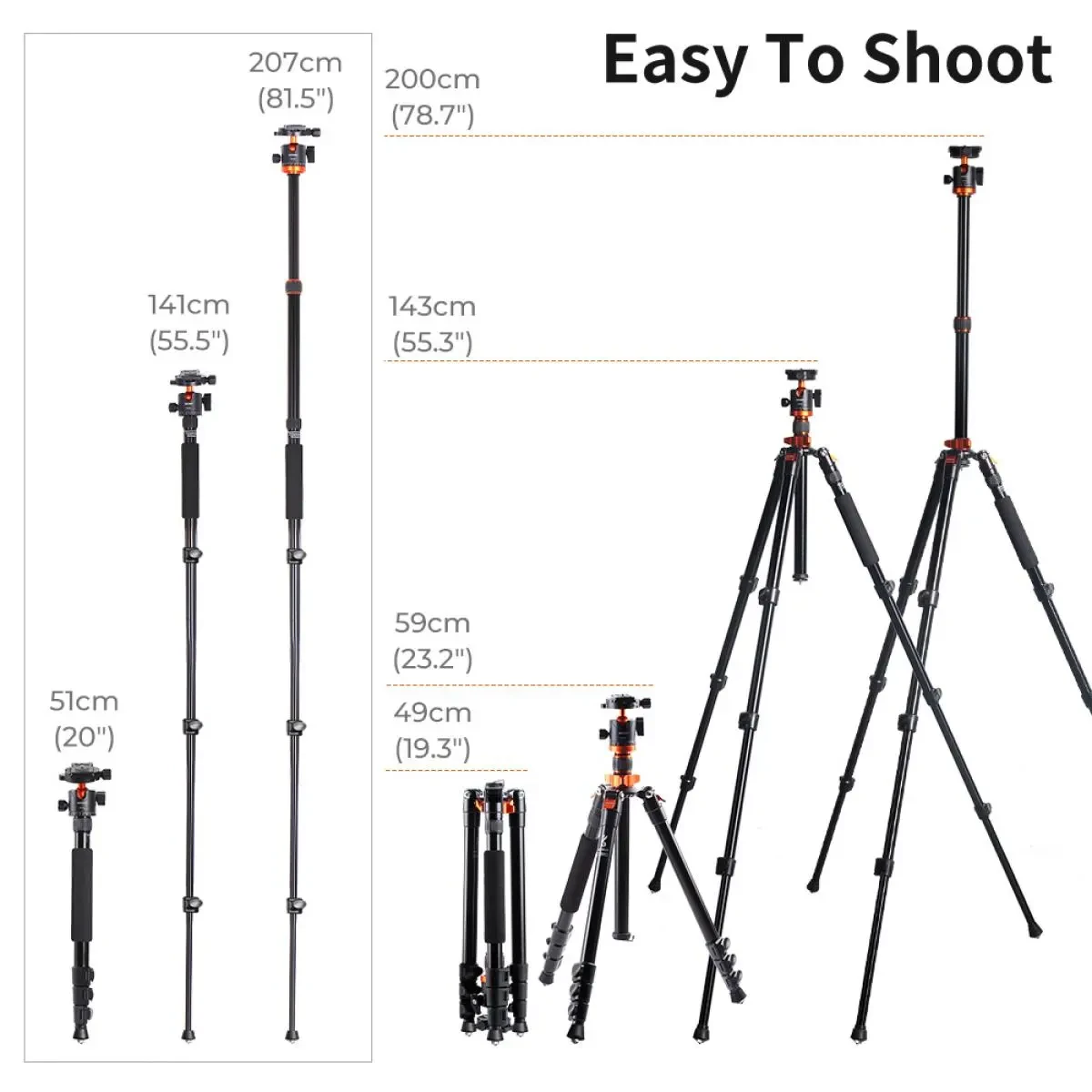 - * 【Práctico: ajuste flexible de 59 cm a 200 cm】 Las patas de 4 secciones con 3 cierres rápidos permiten ajustar la altura de trabajo de 59 cm a 200 cm en cuestión de segundos. ¡El ganador en la categoría de altura! Su tamaño plegado de 45 cm permite transportarlo fácilmente a cualquier lugar para realizar fotografías al aire libre