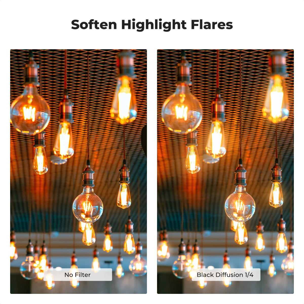 El filtro Black Cine Diffusion está fabricado con cristal óptico de precisión AGC de Japón, provisto de un recubrimiento doble de varias capas para aumentar la transmisión de la luz hasta un 84 %, lo que reduce eficazmente los reflejos de la superficie lisa y no crea viñeteado ni sombras.