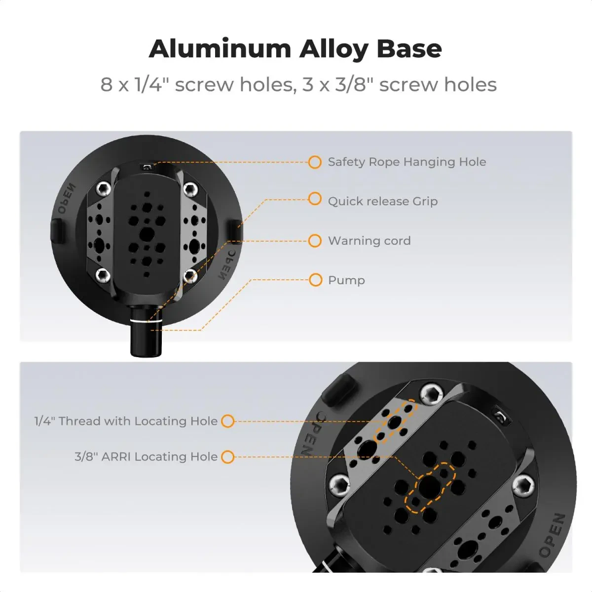 • * 【Amplia compatibilidad】La ventosa cuenta con varias interfaces de expansión con orificios para tornillos de 1/4" y 3/8" y orificios de posicionamiento. La parte superior de la ventosa tiene pasadores de posicionamiento telescópicos de 1/4".