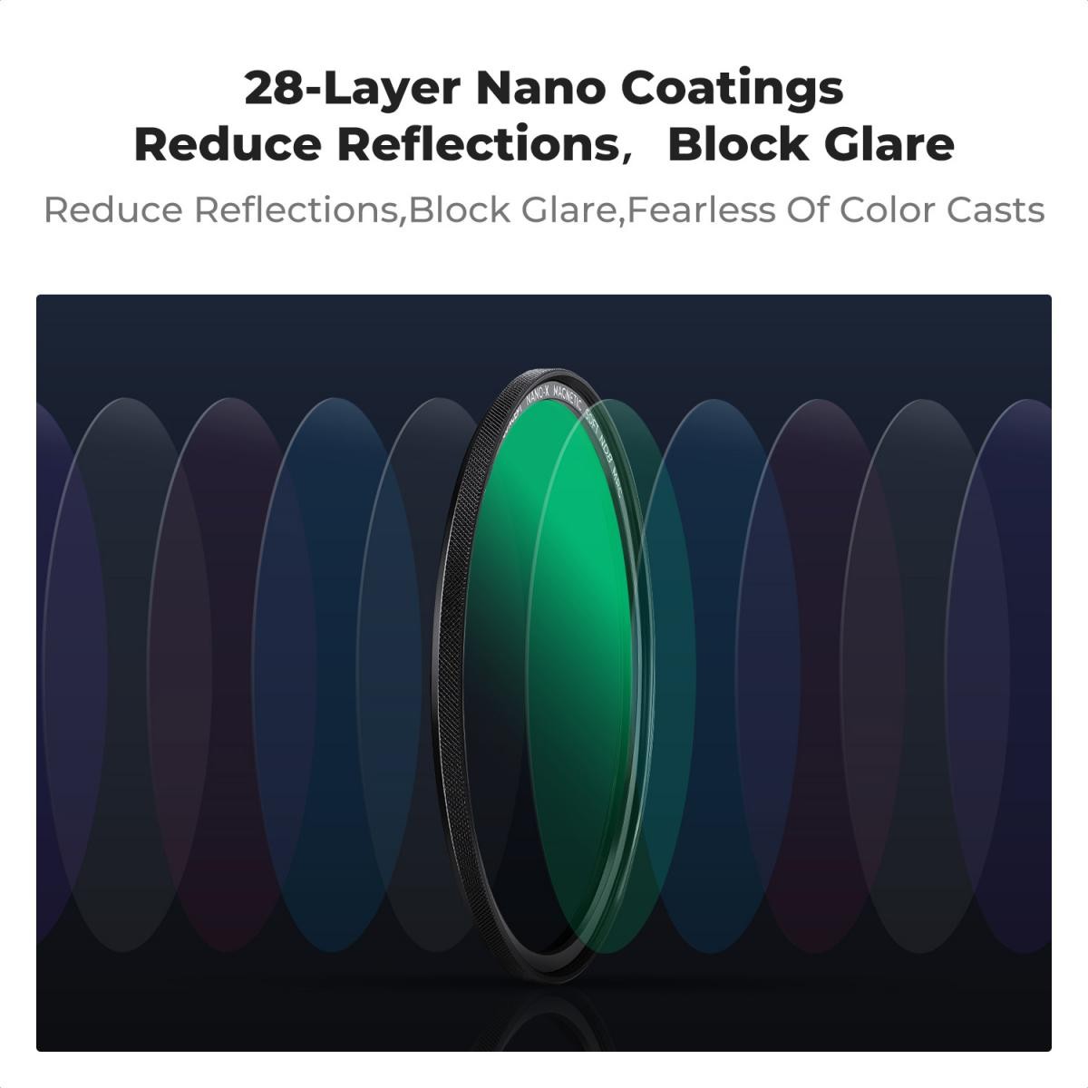 Todos los filtros están fabricados con cristal óptico AGC importado de alta resolución y un recubrimiento nano/multicapa de 28 capas, lo que los hace resistentes al agua, a los arañazos y al aceite, además de garantizar la precisión cromática. El marco ultradelgado fresado con CNC (1,9–3,33 mm) evita la viñeteado en objetivos gran angulares y, al mismo tiempo, garantiza una fácil instalación y desmontaje. El paquete incluye un estuche compacto para los filtros que facilita su transporte y protección.