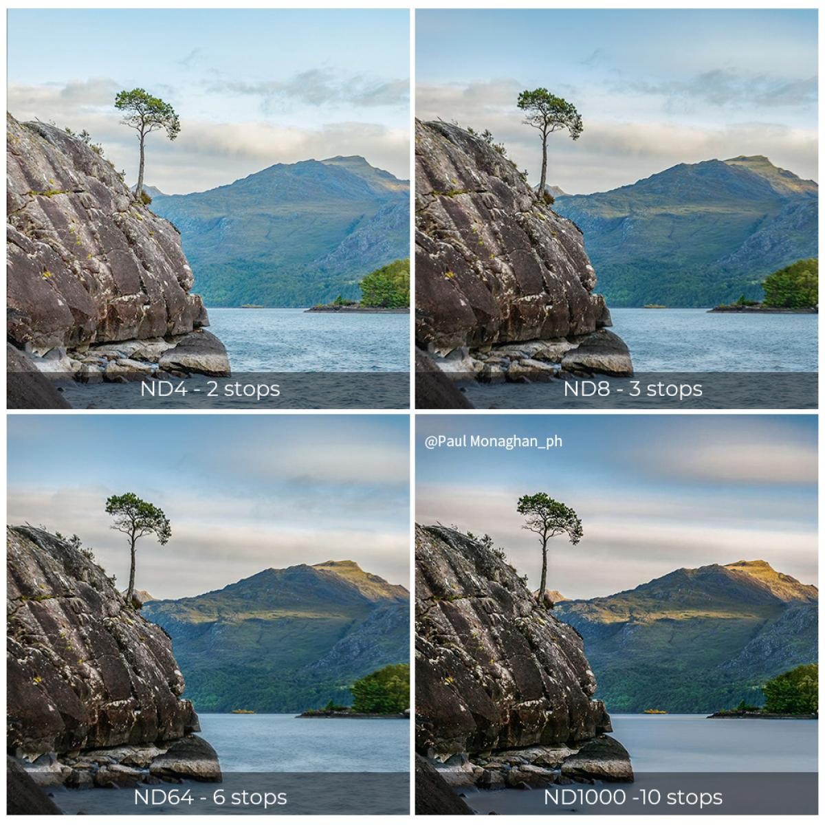 El juego de filtros ND incluye los filtros ND4, ND8, ND64 y ND1000 (una unidad de cada) y un estuche para filtros. El filtro ND (filtro de densidad neutra) sirve para evitar la sobreexposición al fotografiar en exteriores, para regular la luz que entra en el objetivo incluso con una velocidad de obturación lenta para capturar el movimiento borroso del objeto, y recomendamos su uso al fotografiar paisajes.