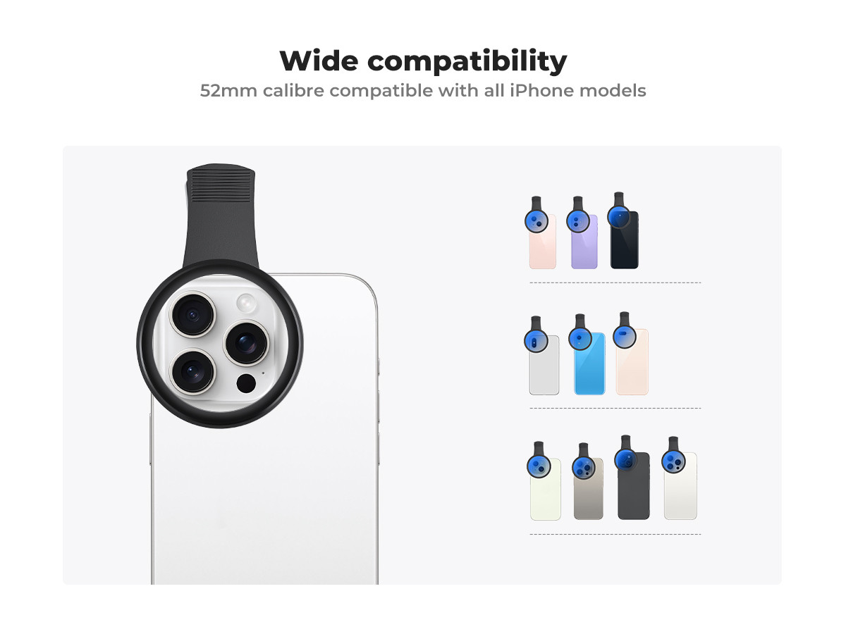 • Compatibilidad: Teléfonos inteligentes con adaptador de 52 mm para fijar el filtro