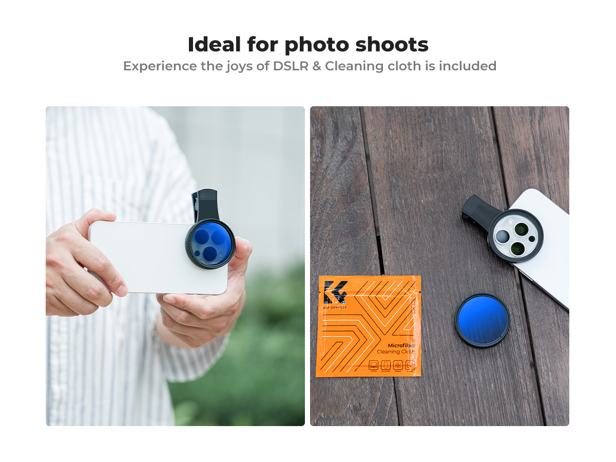 • Fijación segura: gracias al clip, el filtro queda fijado de forma segura en su sitio, sin dañar el teléfono ni interferir en la toma de fotografías.