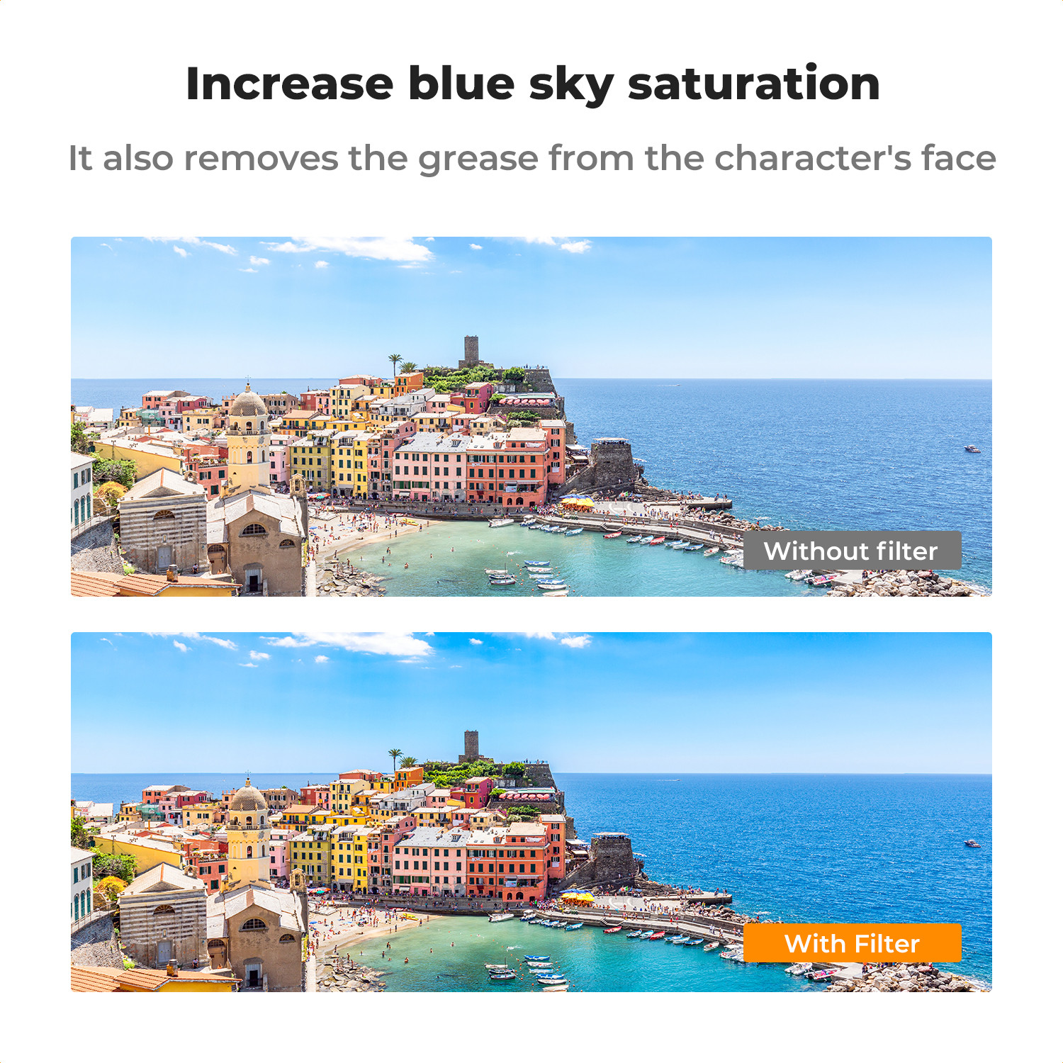 El filtro CPL minimiza eficazmente los destellos y reflejos de superficies no metálicas, como el agua, el cristal y el follaje. Gracias al aumento de la intensidad del color y el contraste, el cielo parece más azul y el verdor más vivo, lo que da vida a tus fotografías. Este filtro es compatible con teléfonos inteligentes que tengan un adaptador de 52 mm para acoplar el filtro, por lo que es versátil para distintos dispositivos.