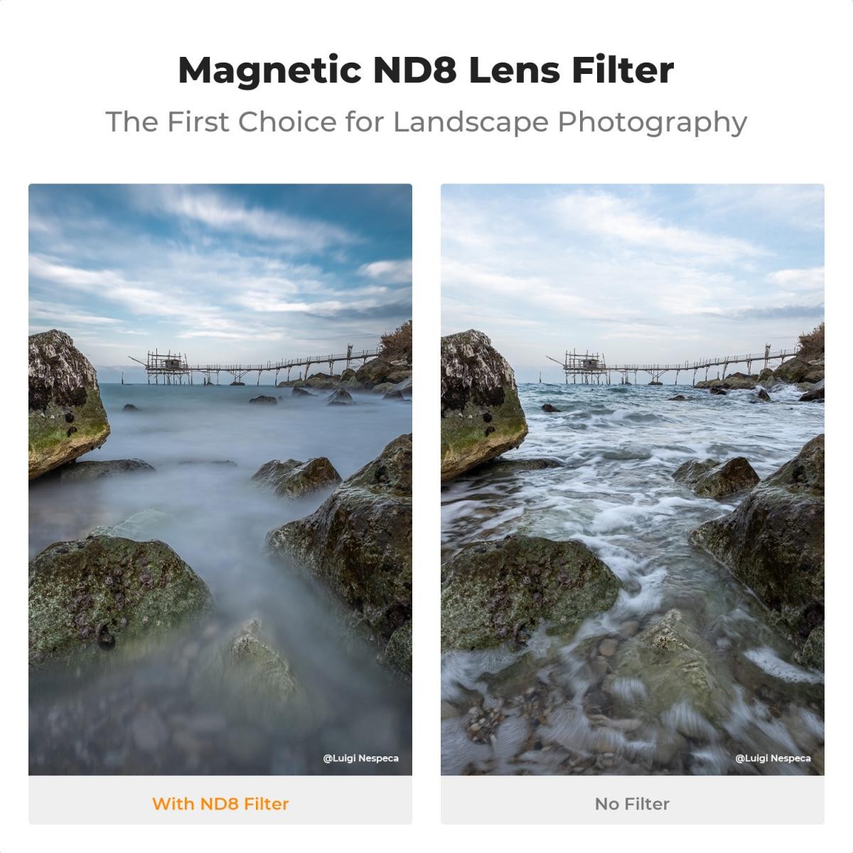 Captura fotografías increíbles con el filtro magnético K&F 55 mm NANO-X-ND8, diseñado para fotógrafos que buscan comodidad y una calidad de imagen excepcional. Gracias al efecto de atenuación de tres pasos ND8, permite un control preciso de la exposición sin afectar a la fidelidad del color. La capa nano verde de 16 capas reduce eficazmente los reflejos, filtra los rayos ultravioleta y aumenta la transmisión de la luz para obtener colores equilibrados y realistas. Pulido ópticamente y recubierto con una capa protectora de alta tecnología, el filtro es resistente al agua, a los arañazos, al moho y al aceite, lo que garantiza su larga vida útil. Su diseño magnético permite montarlo y desmontarlo en un segundo, mientras que la cubierta del objetivo, fabricada en aleación de aluminio de calidad aeronáutica, ofrece la posibilidad de fijación tanto magnética como roscada. El paquete incluye un filtro magnético ND8, un anillo de fijación y una cubierta metálica magnética para una máxima flexibilidad.