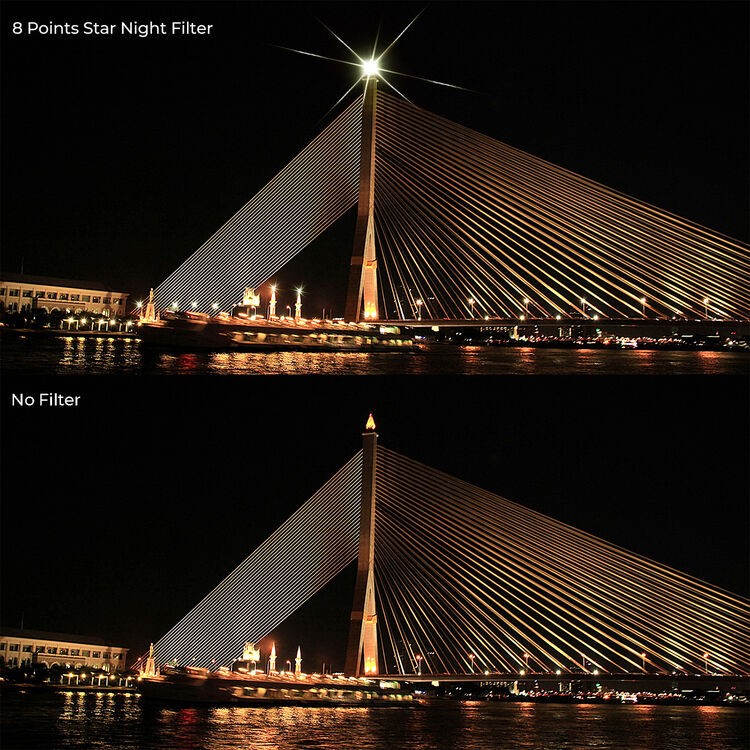 Filtro K&F Concept de 55 mm con efecto estrella variable de 4 u 8 puntas: cristal óptico recubierto de verde con revestimiento multicapa en un fino marco metálico; gira suavemente y permite crear efectos de estrella de 4 u 8 puntas ajustables en fuentes de luz puntuales.
