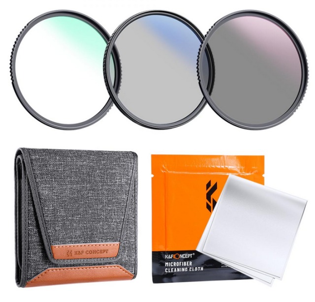 El juego de filtros profesionales para objetivos K&F de 58 mm (3 unidades) es un conjunto de accesorios versátil e imprescindible para los fotógrafos que desean mejorar su experiencia fotográfica. Este juego incluye tres filtros esenciales: un filtro UV para proteger el objetivo y reducir la radiación ultravioleta, un filtro CPL (polarizador circular) para minimizar los reflejos y aumentar la intensidad del color, y un filtro ND4 (densidad neutra) para reducir la exposición a la luz y lograr un efecto de desenfoque de movimiento.