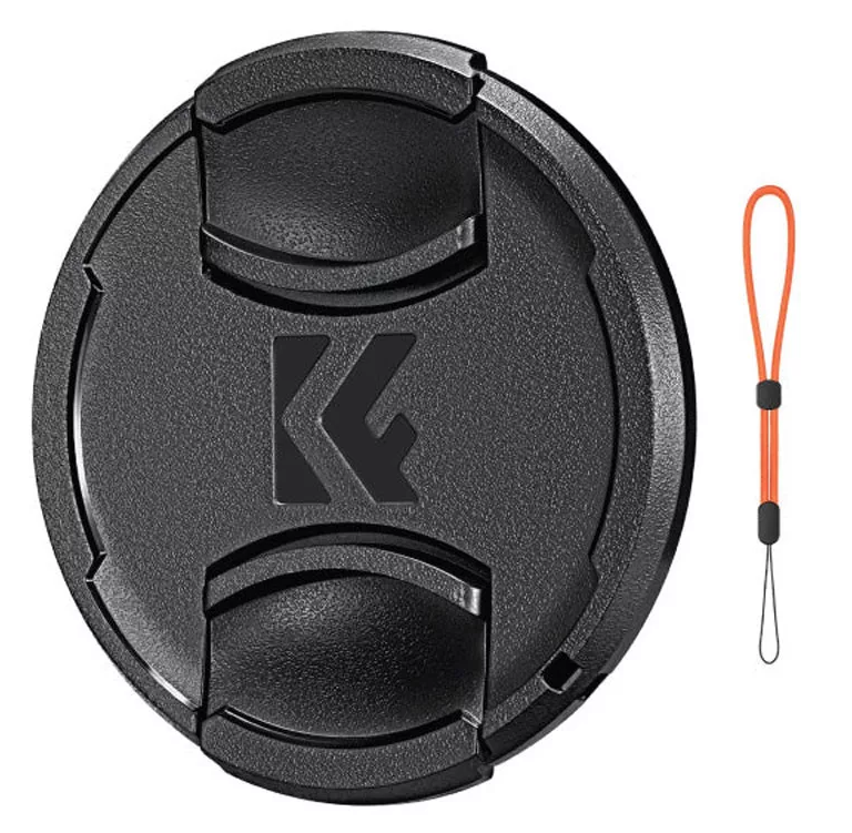 Tapa para objetivo K&F Concept de 58 mm con el logotipo de KF y cordón antiextravío: diseño a presión con fijación central, sin resorte, fabricada en ABS, empaquetada individualmente en una bolsa de OPP para protegerla del polvo y los arañazos.
