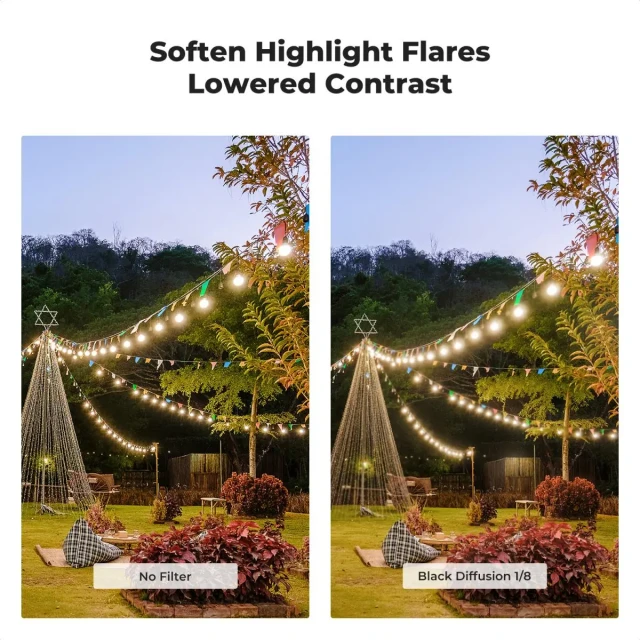 - * 【Sin viñeteado】Este filtro difusor negro de 1/8 con un marco ultrafino de solo 3,3 mm de grosor evita el viñeteado y las esquinas oscuras en objetivos gran angulares y teleobjetivos. El marco con diseño antideslizante CNC facilita la instalación y el desmontaje.