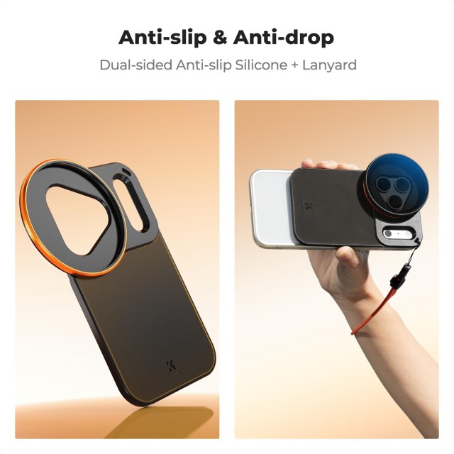 Para mayor seguridad y comodidad, el soporte está equipado con almohadillas de silicona antideslizantes, un marco que absorbe los golpes, un orificio para cordón y un cordón incluido que evita caídas. La bolsa multifuncional de EVA mate con bolsillos de malla y cintas elásticas mantiene el soporte magnético y los filtros organizados y protegidos, mientras que sus dimensiones compactas (16 × 11 × 4,5 cm) facilitan su transporte junto con otros accesorios. Se alcanza un rendimiento óptimo cuando se utiliza con el iPhone sin funda; el uso limitado con fundas oficiales de Apple es compatible gracias al anillo magnético incluido.