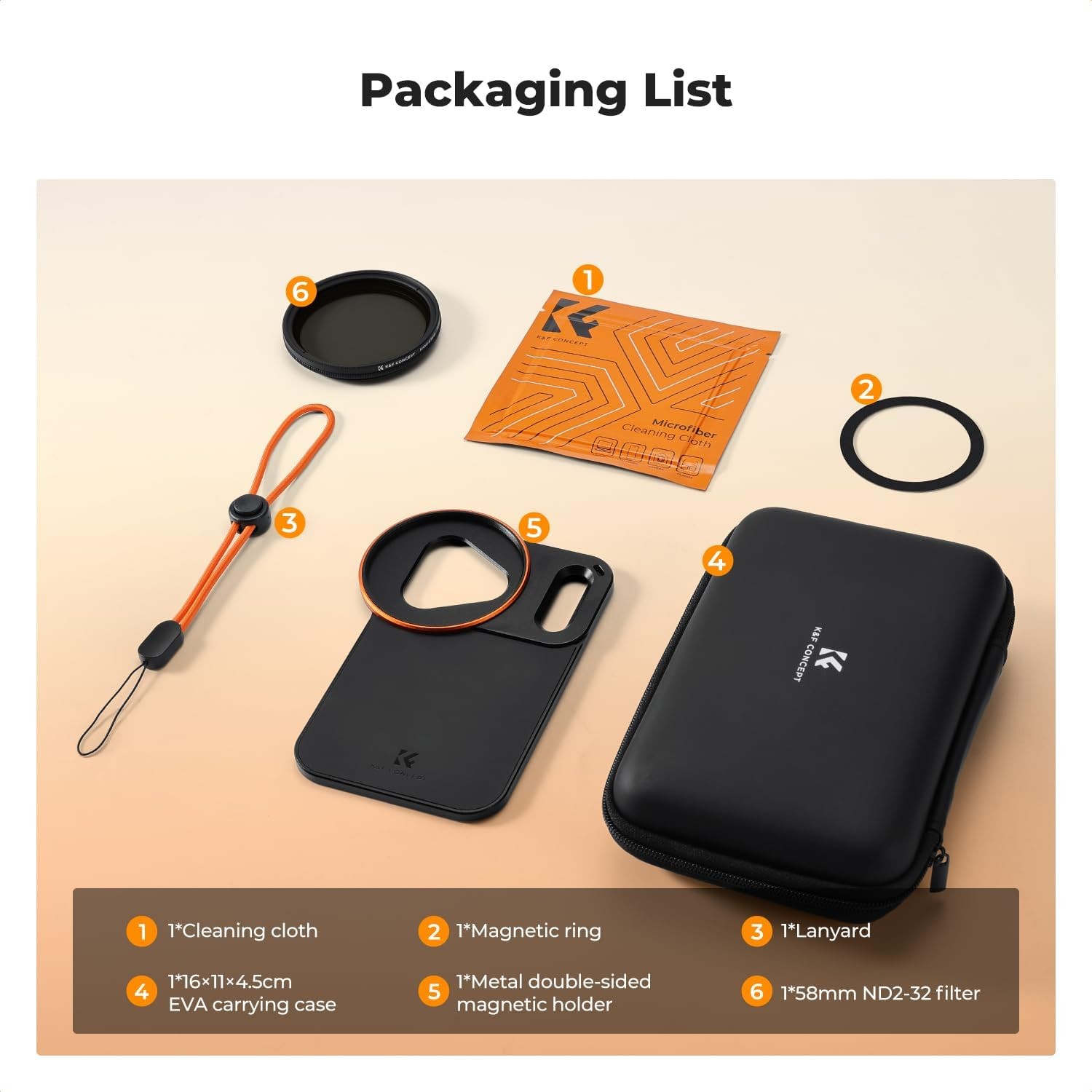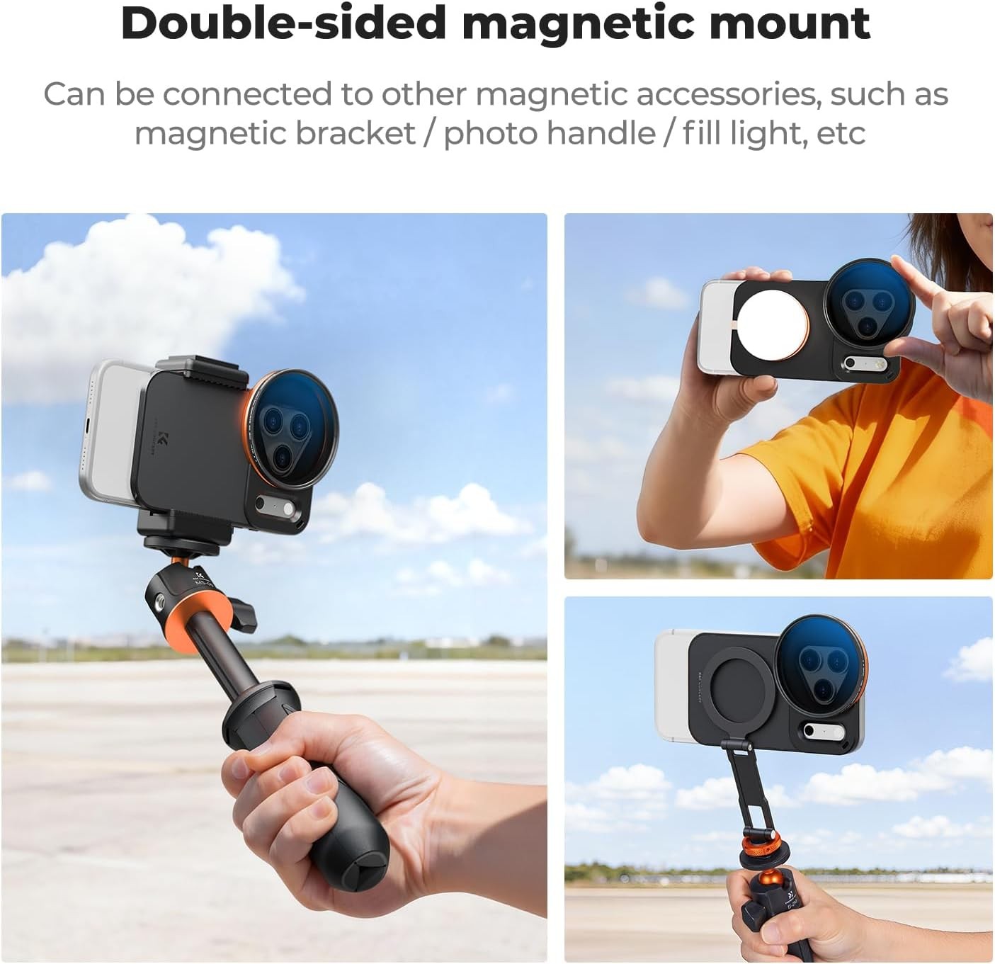 El soporte magnético de doble cara atornillable K&F de 58 mm para el iPhone 17 Pro Max ofrece una fijación precisa, potentes imanes de doble cara y es compatible con filtros de 58 mm de diámetro, incluido el filtro VND incluido. Garantiza una fotografía móvil estable, segura y versátil con una protección completa y un almacenamiento portátil.