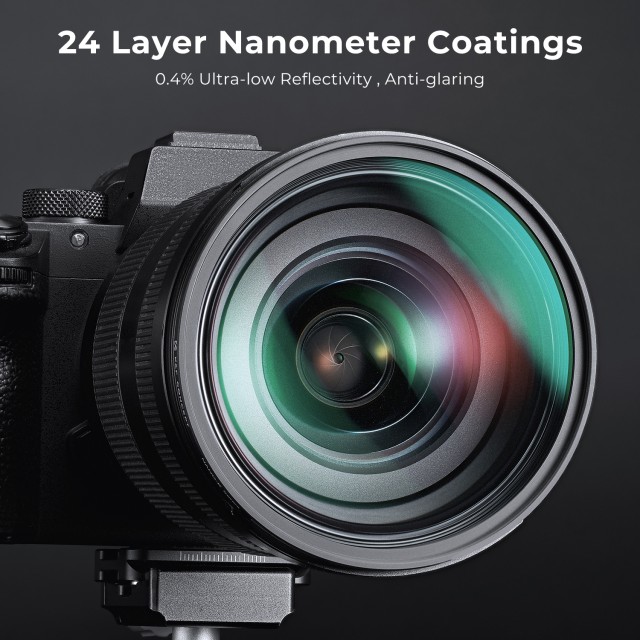 El filtro difuminador negro K&F de la serie A, de 62 mm y 1/8, mejora la imagen cinematográfica al suavizar las arrugas, las manchas y los poros sin perder nitidez, por lo que es ideal para retratos y entornos con bajo contraste. Está fabricado con cristal óptico alemán de alta calidad con un revestimiento antirreflectante de 24 capas en ambos lados, que reduce los reflejos y evita la aparición de imágenes fantasma. El pulido y esmerilado de precisión mantiene la estabilidad molecular y garantiza la nitidez incluso con teleobjetivos. El marco de aluminio de calidad aeronáutica es muy fino (3,3 mm) para evitar la viñetación en los objetivos gran angulares. Además, el tratamiento superficial resistente al agua y al moho permite eliminar fácilmente las manchas de agua y aceite, y garantiza resistencia y una larga vida útil.