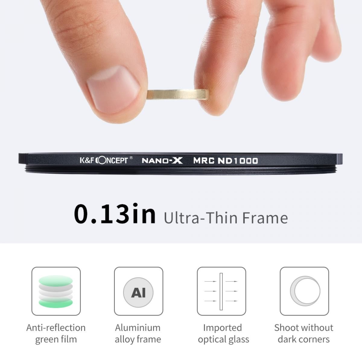 El filtro K&F 62 mm XN26 Nano-X Fixed ND1000 proporciona una reducción real de la luz de 10 pasos sin distorsión cromática. Está fabricado con cristal óptico de primera calidad, cuenta con un recubrimiento nano de 28 capas y un marco de aluminio ultradelgado para obtener fotografías impresionantes con exposición prolongada sin viñeteado.