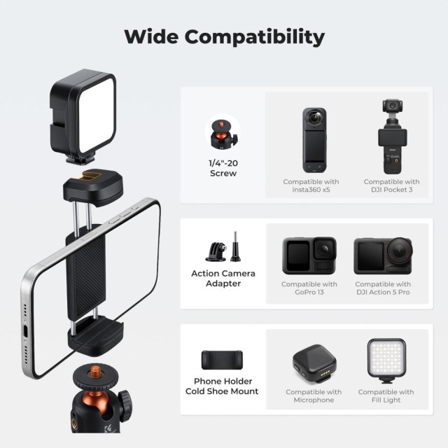 Equipado con una rosca estándar de 1/4" en la cabeza del soporte, compatible con cámaras compactas de marcas como Canon y Sony. Incluye adaptadores para cámaras de acción y un soporte para el teléfono, lo que lo hace ideal para su uso con DJI Pocket 3, GoPro, DJI Osmo Action, Insta360, smartphones y otros dispositivos.