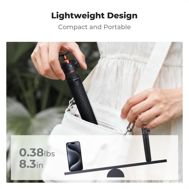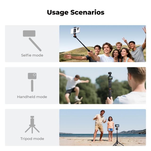 Este mini palo selfie y minitrípode de 25,6" cuenta con una rótula de 360° y una zapata Cold Shoe. Es compatible con la DJI Osmo Pocket 3, la Action 5 Pro, la GoPro Hero 13 y los smartphones.