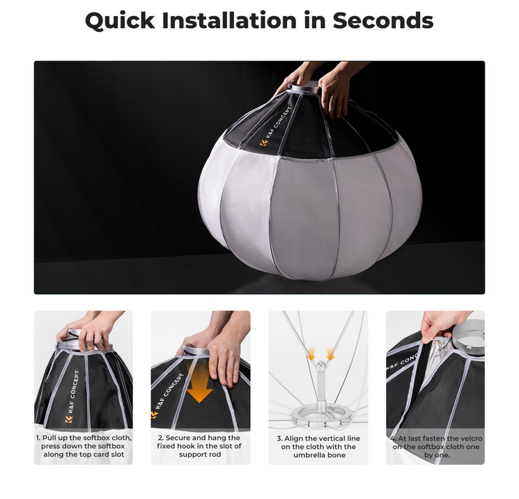 Consigue una iluminación suave y uniforme de 360°, ideal para su uso en estudio, con la caja de luz K&F 65CM Lantern Soft Light Box. Perfecta para fotógrafos y cineastas que necesitan una solución de iluminación eficaz y portátil.