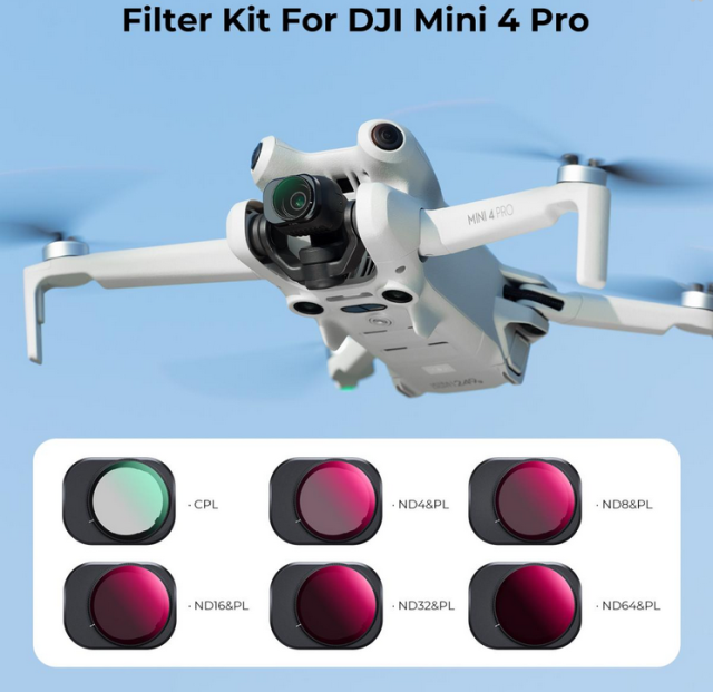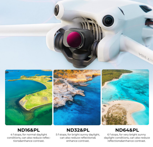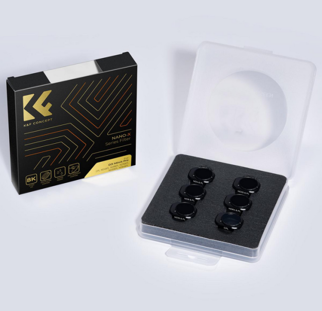 El juego de filtros K&F de 6 unidades para DJI Mini 4 Pro incluye filtros CPL, ND4&PL, ND8&PL, ND16&PL, ND32&PL y ND64&PL, que garantizan un control integral de la luz y mejoran la calidad de la imagen. Estos filtros están fabricados con cristal óptico AGC de primera calidad con 28 capas de nanorrevestimiento y ofrecen una protección resistente y una nitidez de alta resolución. El juego combina las funciones ND y CPL, que reducen los reflejos, controlan la luz y mejoran la saturación del color y el contraste sin afectar a la calibración ni al equilibrio del gimbal.